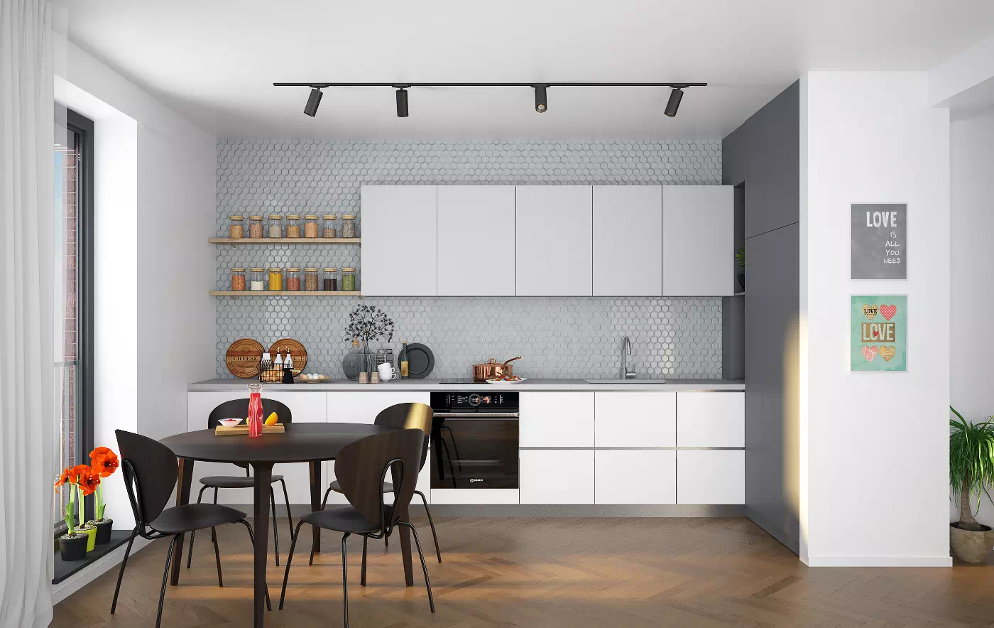 Dritaret janë të profilit gjerman me ngjyrë antracit dhe xham tre-shtresor të kombinuara me roleta alumini me të njejtën ngjyrë për t'i dhënë dizajnit